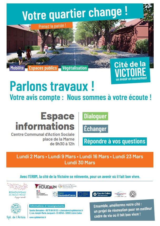 Dans le cadre de l'Engagement pour le Renouveau du Bassin Minier, la SPL de l'Artois tiendra des permanences les 2, 9, 16, 23 et 30 mars afin d'informer les habitants sur les aménagements à venir Cité de la Victoire.